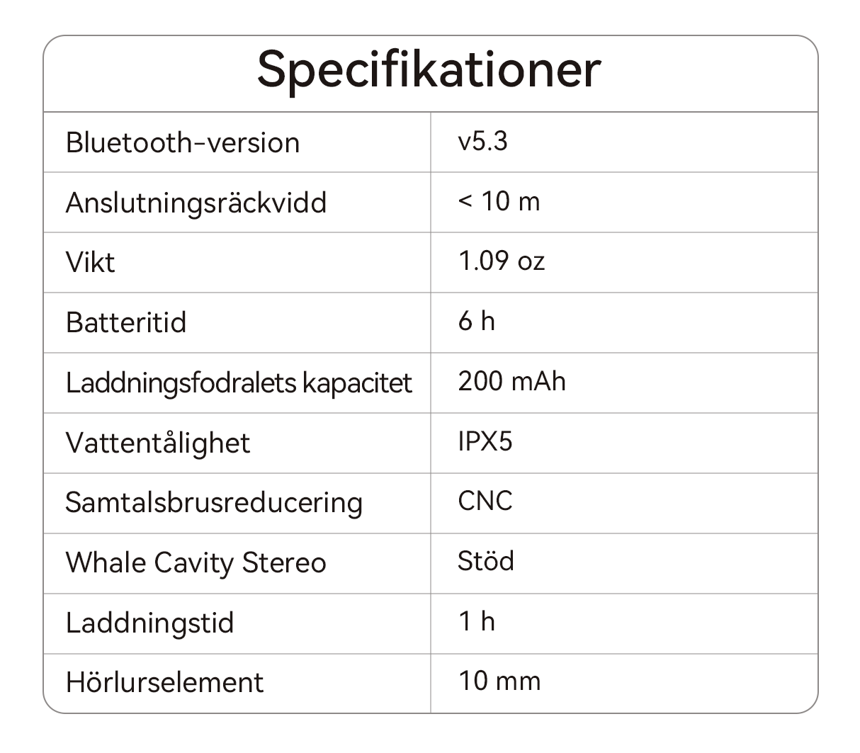 - Lång Batteritid & Laddningsfodral — 24 timmars spelningstid, 480 timmars standby, snabb laddning.